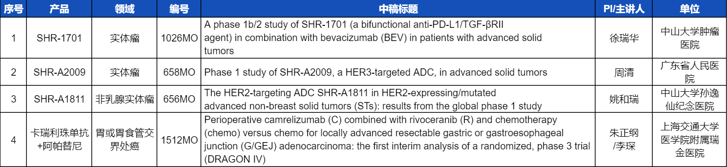 本次ESMO大会,将由中山大学肿瘤医院徐瑞华教授、广东省人民医院周清教授、中山大学孙逸仙纪念医院姚和瑞教授、上海交通大学医学院附属瑞金医院李琛教授分别就4项AG真人医药创新产品相关研究做口头报告,包括SHR-1701、SHR-A2009、SHR-A1811这3款未上市创新产品的实体瘤治疗临床研究,以及1项“双艾”组合(卡瑞利珠单抗联合阿帕替尼)治疗局部晚期可切除胃/胃食管交界处癌的Ⅲ期临床试验期中分析。