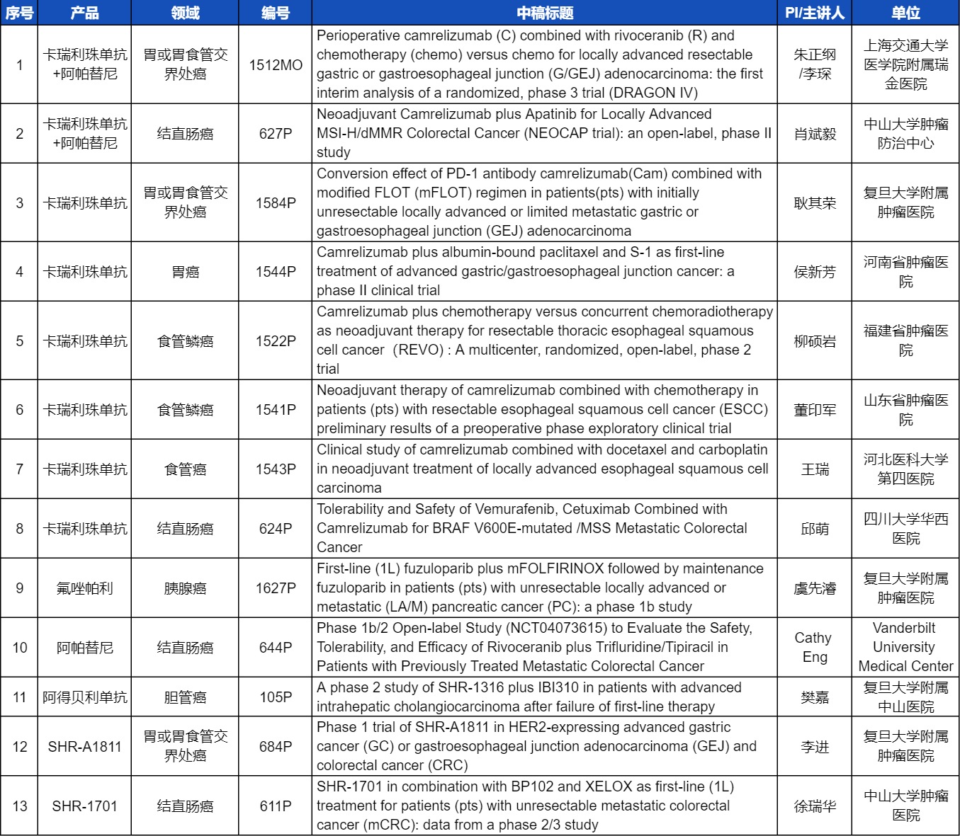 在消化系统肿瘤领域,AG真人创新产品相关研究共入选1项口头报告和12项壁报展示。除了经典的明星药物卡瑞利珠单抗和阿帕替尼,SHR-A1811、SHR-1701等未上市创新产品也有相应研究入选。此外,阿得贝利单抗、氟唑帕利等已上市药物也在积极探索新的适应症,本次ESMO大会分别有肝内胆管癌和胰腺癌相关研究入选。这些新老药物前沿研究的不断出现,有望为消化系统肿瘤患者带来新的福音!