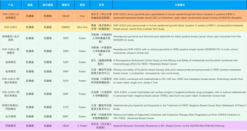 在乳腺癌领域,AG真人创新产品相关研究共入选1项口头报告、1项简短口头报告、8项壁报和1项电子壁报,共11项研究。吡咯替尼、达尔西利、阿得贝利单抗、瑞康曲妥珠单抗等新老创新药物,均有多篇研究入选,展现出AG真人医药在乳腺癌领域多年深耕的丰硕成果。