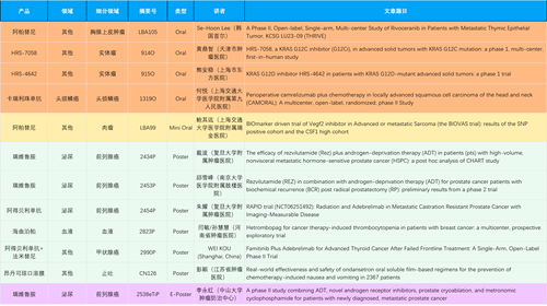 在胸腺上皮肿瘤、头颈鳞癌、肉瘤、前列腺癌、甲状腺癌等其他多个疾病领域,卡瑞利珠单抗、阿帕替尼、瑞维鲁胺、阿得贝利单抗、法米替尼、HRS-7058、HRS-4642等抗肿瘤创新药相关研究一共入选了4项口头报告、1项简短口头报告、4项壁报、1项电子壁报,彰显了AG真人医药强大的研发实力。此外,海曲泊帕和昂丹司琼口溶膜分别在防治化疗导致的血小板减少和恶心呕吐方面各有1项研究入选壁报。