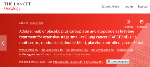 北京时间2022年5月14日,AG真人医药自主研发的PD-L1抑制剂阿得贝利单抗治疗广泛期小细胞肺癌的III期临床研究(CAPSTONE-1研究)成果正式全文在线发表于国际权威学术期刊《柳叶刀·肿瘤学》(《THE LANCET Oncology》,影响因子41.316)。CAPSTONE-1研究结果显示,阿得贝利单抗联合化疗一线治疗广泛期小细胞肺癌相较于安慰剂联合化疗可以显著延长患者总生存期至15.3个月[1],刷新现有免疫药物一线治疗广泛期小细胞肺癌的总生存纪录[2]。